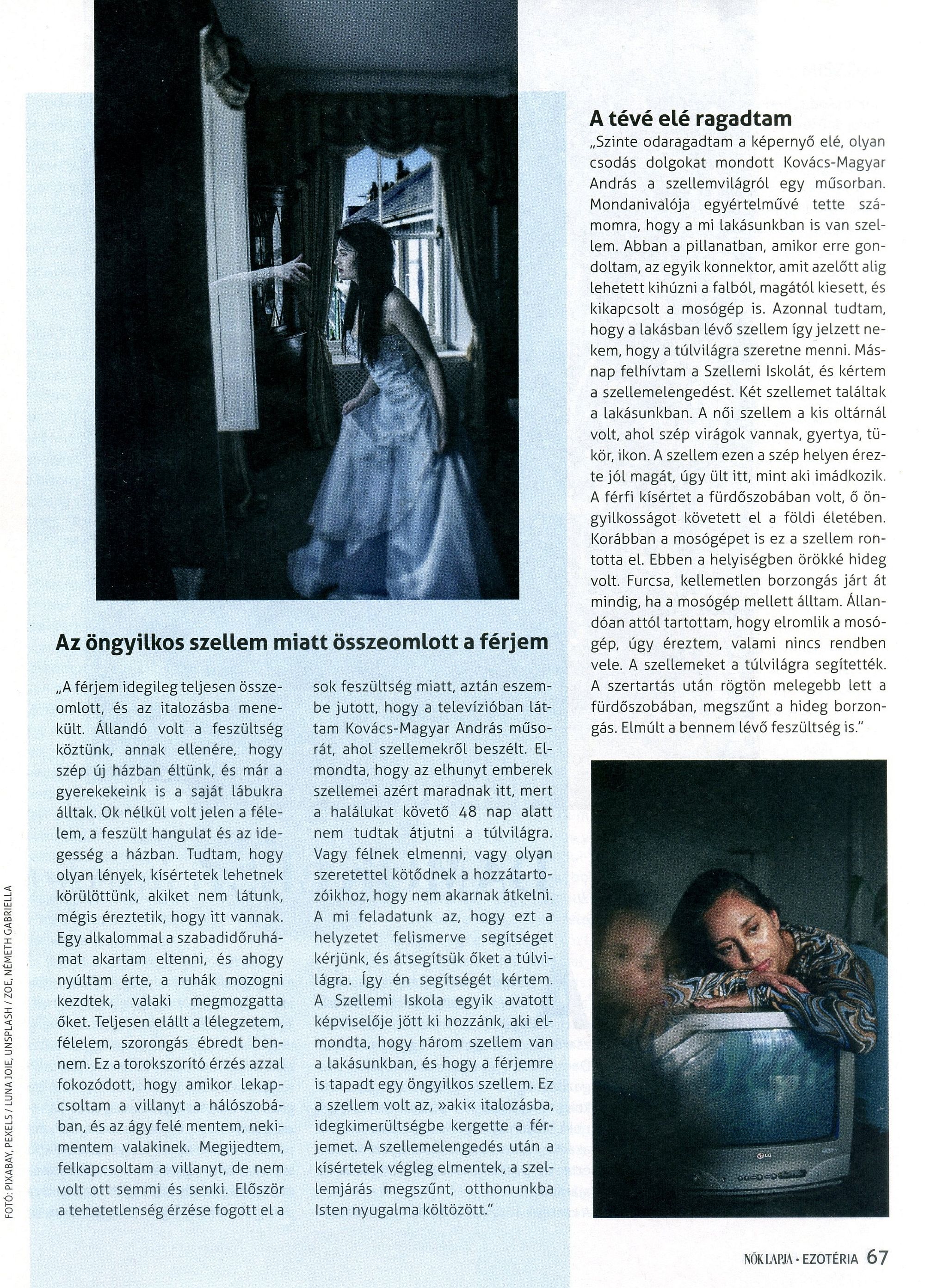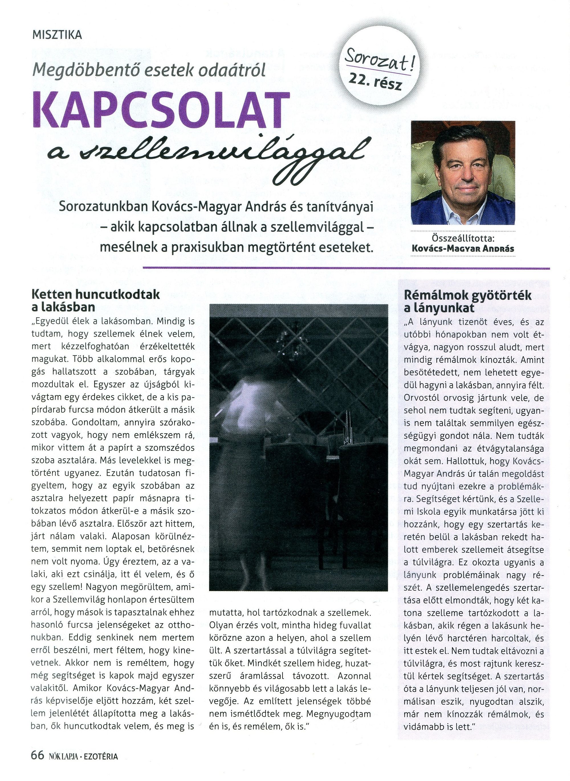 Megdöbbentő esetek odaátról Megjelent a Nők Lapja Ezotéria - Misztika rovatában Sorozatunkban Kovács-Magyar András és tanítványai – akik kapcsolatban állnak a szellemvilággal - beszélnek a praxisukban megtörtént esetekről.